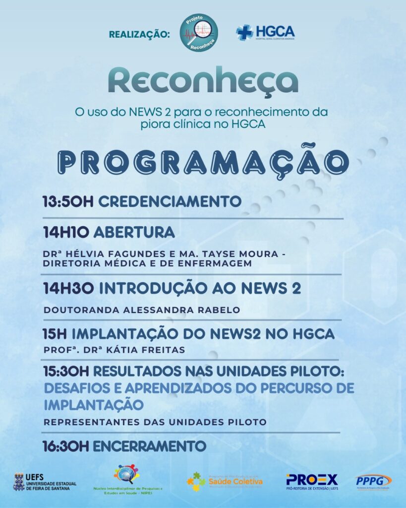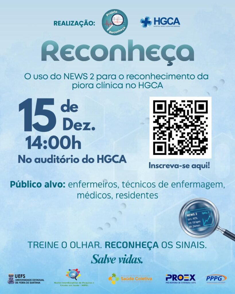 O Projeto Reconheça, desenvolvido pela UEFS em parceria com o HGCA, convida você para um encontro sobre a implantação do escore NEWS2 como ferramenta para o reconhecimento precoce da piora clínica nas enfermarias do hospital. Durante o evento, será apresentado o andamento do protocolo no HGCA, seus benefícios para a segurança do paciente e o papel fundamental das equipes assistenciais nesse processo.