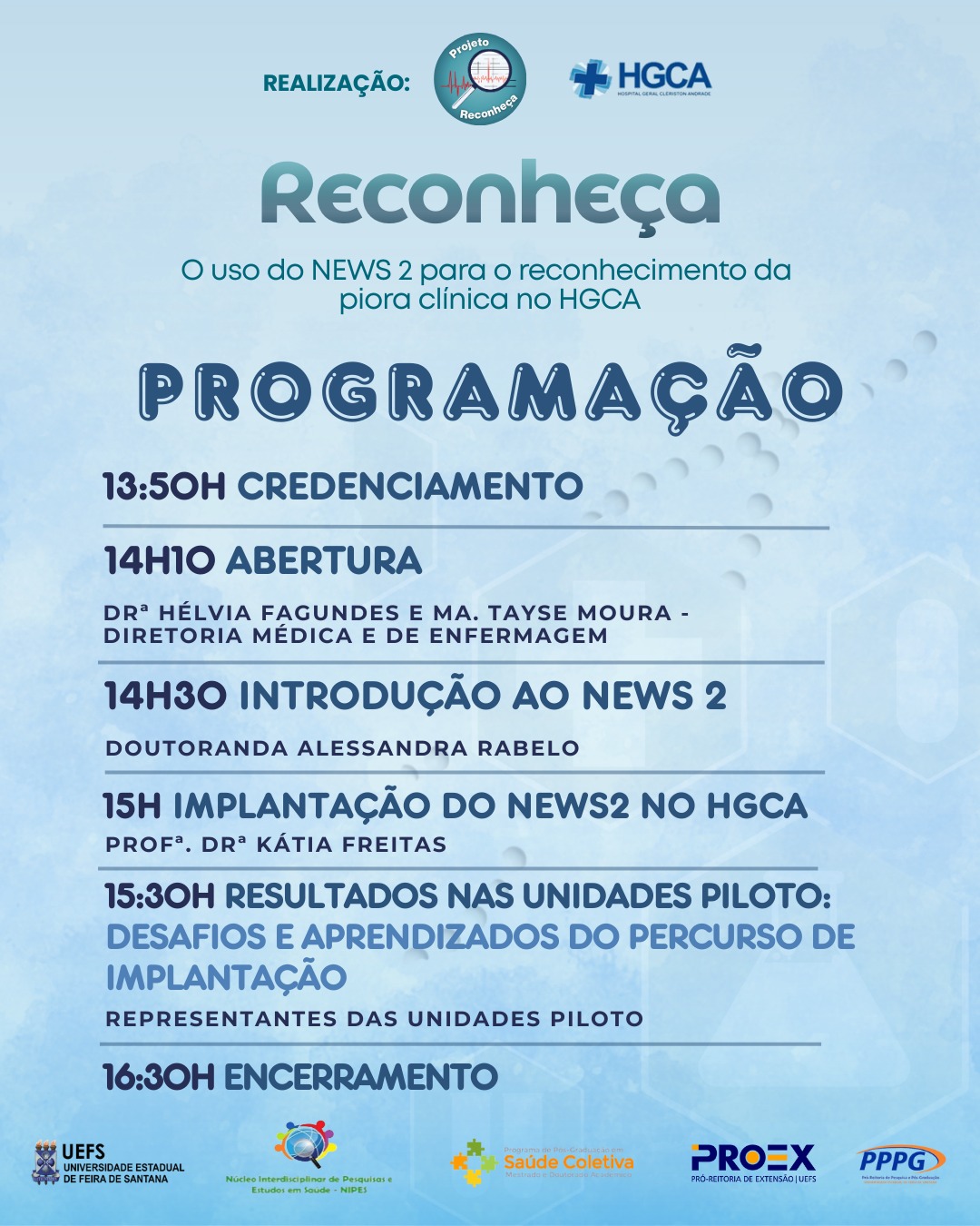 O Projeto Reconheça, desenvolvido pela UEFS em parceria com o HGCA, convida você para um encontro sobre a implantação do escore NEWS2 como ferramenta para o reconhecimento precoce da piora clínica nas enfermarias do hospital. Durante o evento, será apresentado o andamento do protocolo no HGCA, seus benefícios para a segurança do paciente e o papel fundamental das equipes assistenciais nesse processo.