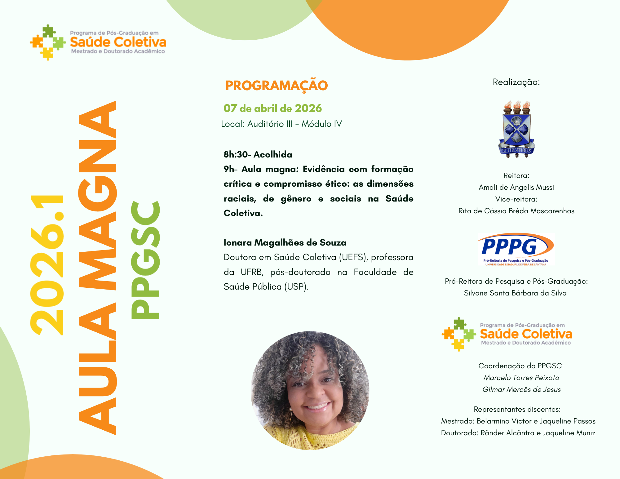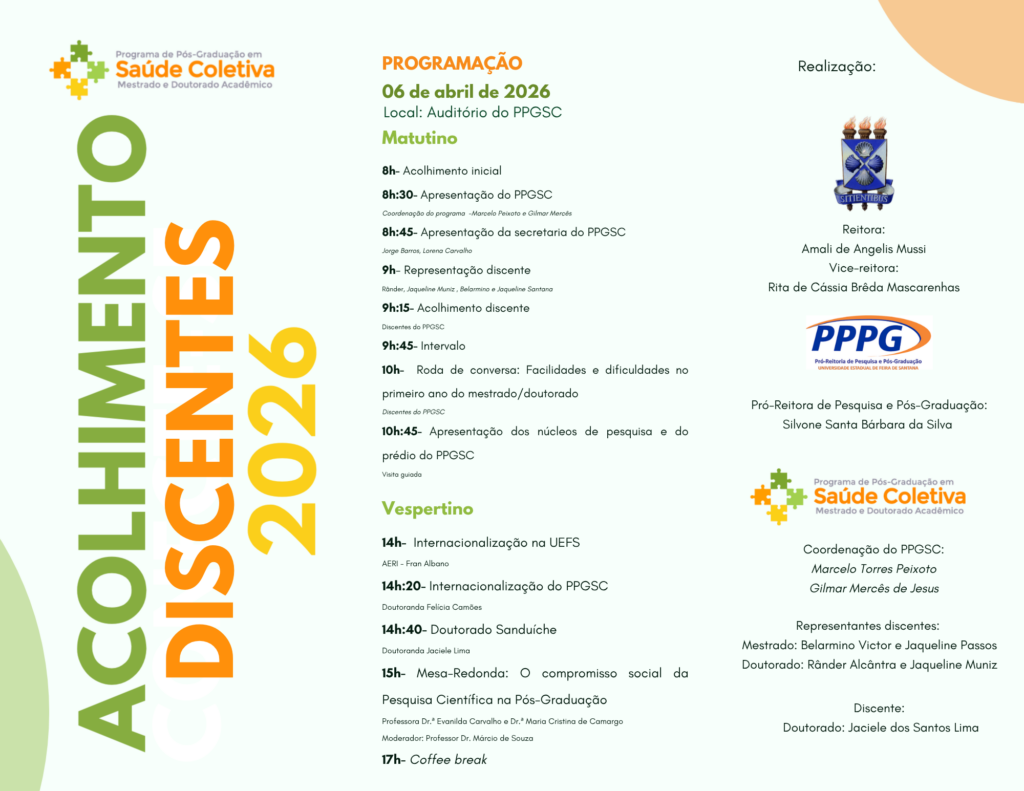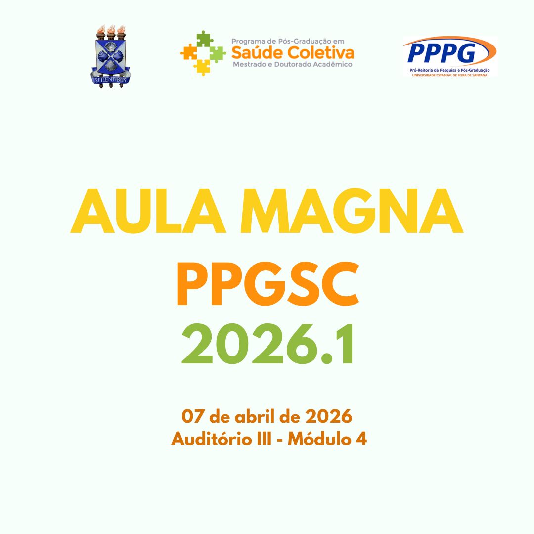 O Programa de Pós-Graduação em Saúde Coletiva (PPGSC) da Universidade Estadual de Feira de Santana (UEFS) tem a satisfação de convidar os discentes e docentes do PPGSC para o Acolhimento da Turma 2026 e convidar toda a comunidade acadêmica para a Aula Magna do semestre 2026.1.