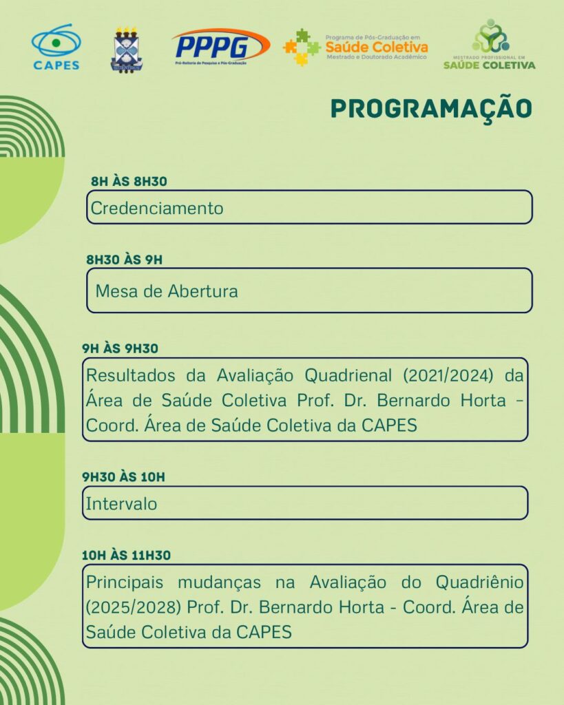 Este evento será promovido por nosso programa em parceria com o Mestrado Profissional de Saúde Coletiva (MPSC) e a Pró-reitoria de Pesquisa e Pós-graduação (PPPG); e, contará com a presença do Prof. Bernardo Horta – Coordenador da Área de Saúde Coletiva da CAPES.