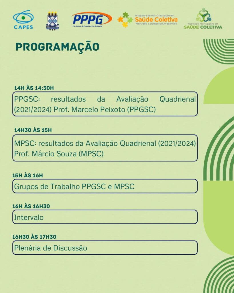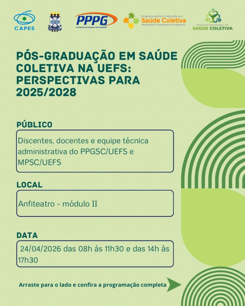 Como primeira ação do Planejamento Estratégico do PPGSC referente ao novo Quadriênio, estaremos realizando no dia 24/04/2026 o Seminário “Pós-graduação em Saúde Coletiva na UEFS: perspectivas para 2025/2028”.