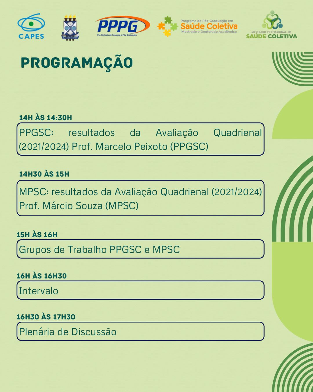 Este evento será promovido por nosso programa em parceria com o Mestrado Profissional de Saúde Coletiva (MPSC) e a Pró-reitoria de Pesquisa e Pós-graduação (PPPG); e, contará com a presença do Prof. Bernardo Horta – Coordenador da Área de Saúde Coletiva da CAPES.