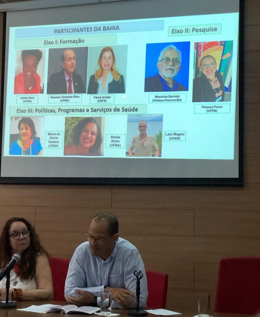 Durante o seminário, os pesquisadores Naomar de Almeida Filho (ISC/UFBA), Guilherme Werneck (MS), Tânia Araújo (Uefs), Enirtes Caetano (ENSP/Fiocruz), Maria de Jesus Fonseca (ENSP/Fiocruz) e Laio Magno (Uneb) compartilharam as principais diretrizes do plano e ofereceram reflexões sobre seus objetivos e estratégias.